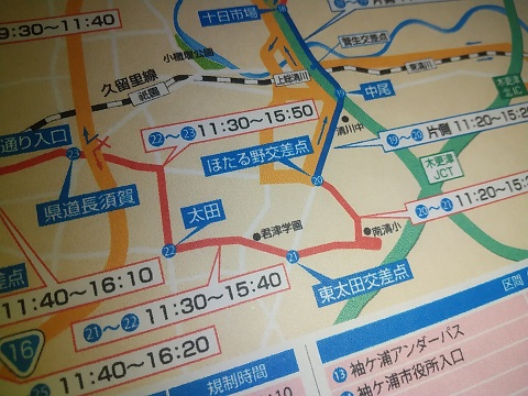 君津、真船方面からのお越しの際は太田から木更津駅までの道路が11:30~15:40までが通行出来ない様です。
